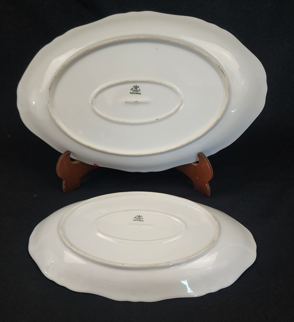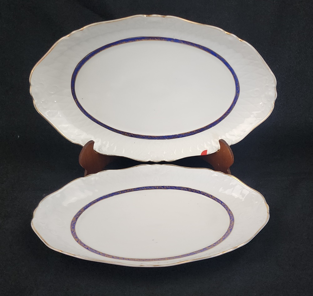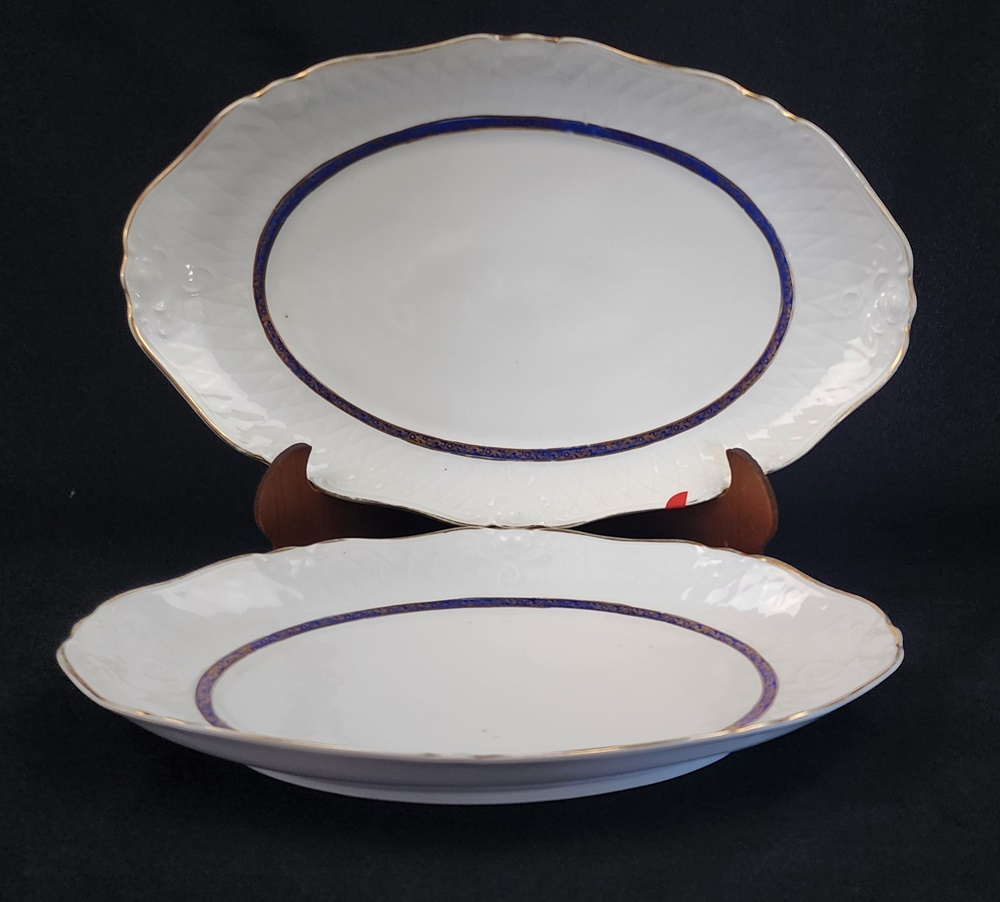 Apresenta friso central em azul cobalto com delicados arabescos dourados, além de filete em ouro na borda. Modelo clássico e atemporal. Manufatura no verso.