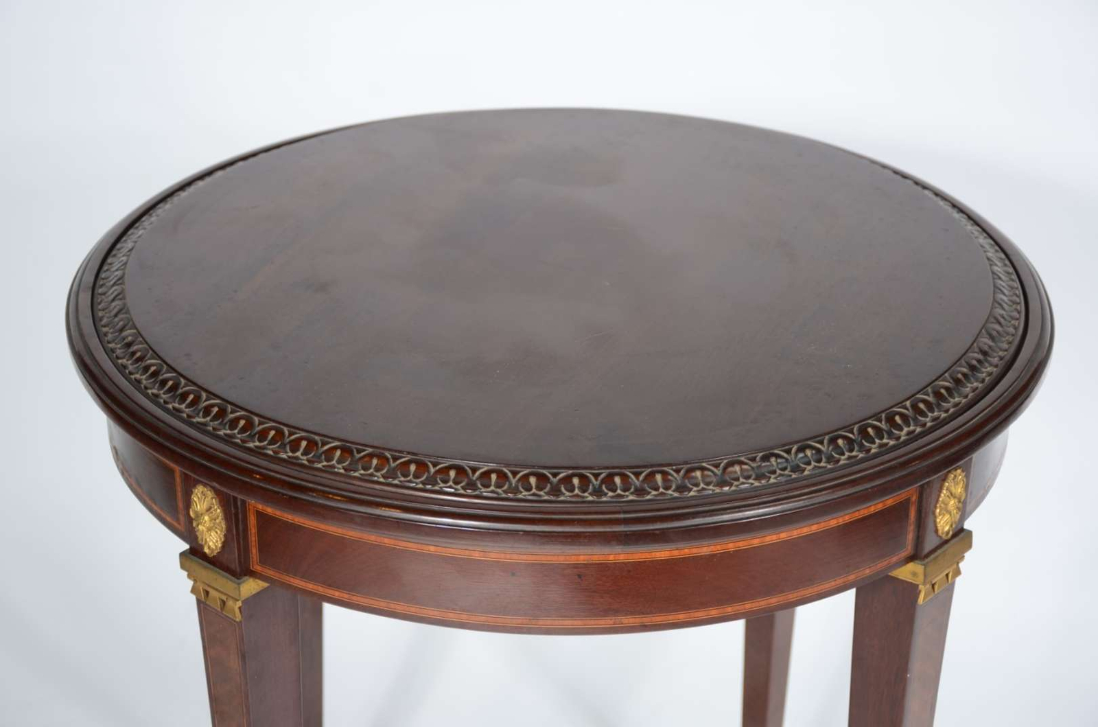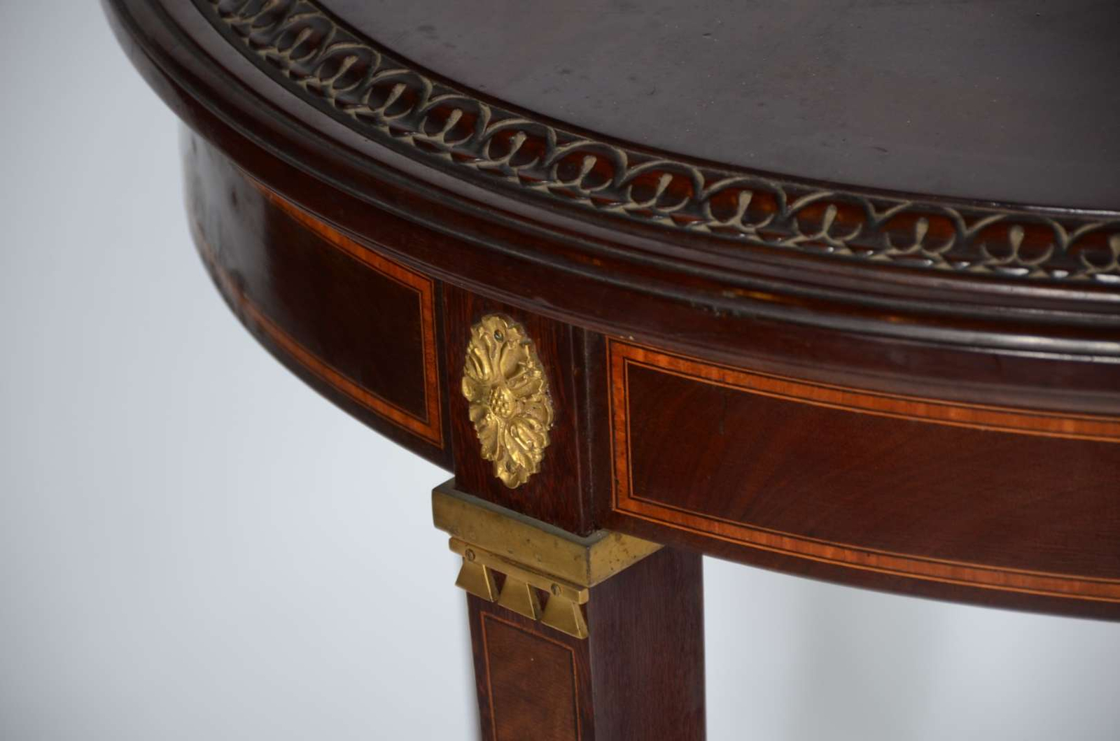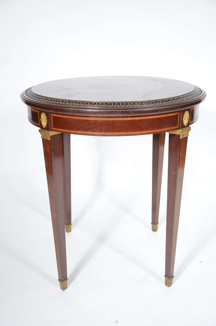Mesa de apresentação de madeira nobre feitio redondo saia com filetado e detalhes de metal dourado, quatro pernas quadrangulares com ponteiras de metal.