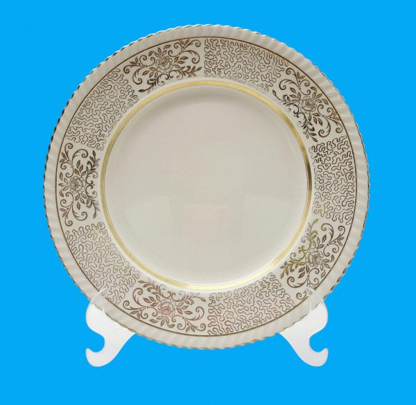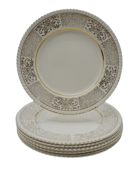 Conjunto com 06 pratos rasos, em porcelana inglesa na cor marfim, manufatura OHNSON BROS ENGLAND OLD ENGLISH ornamentados com delicados traços e arabescos florais dourados.
