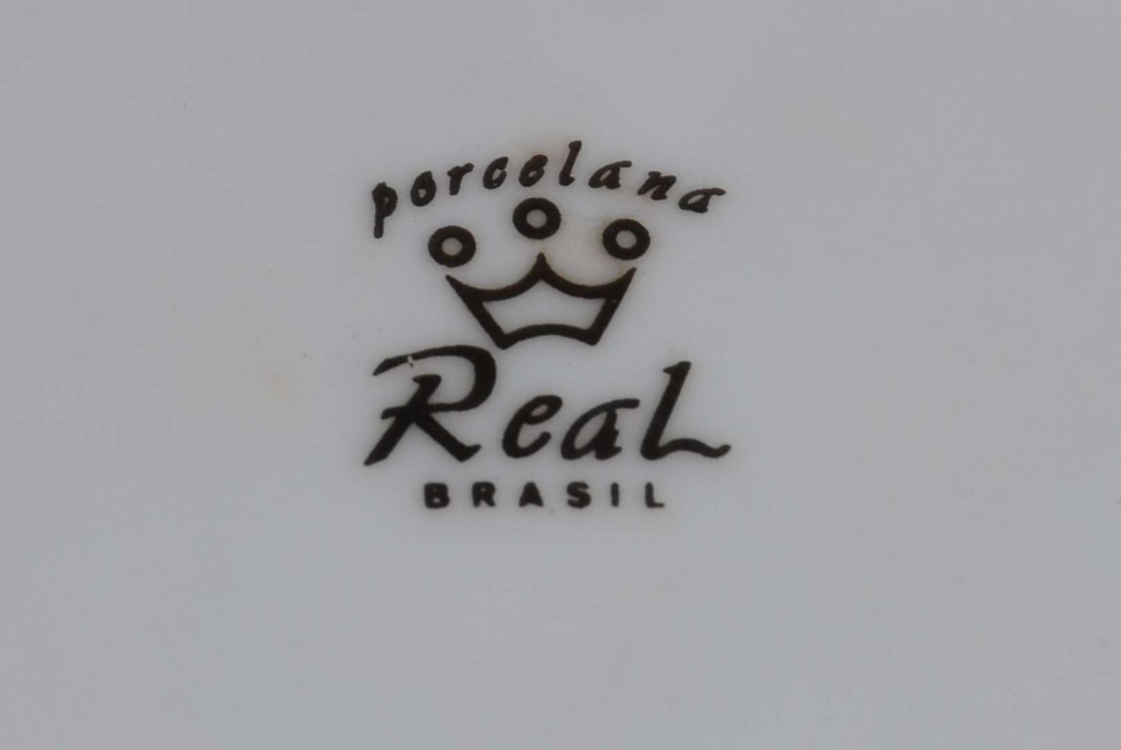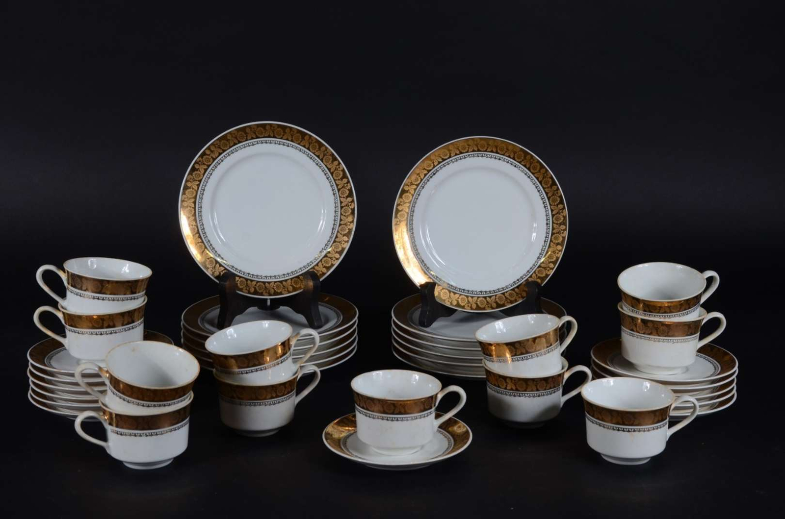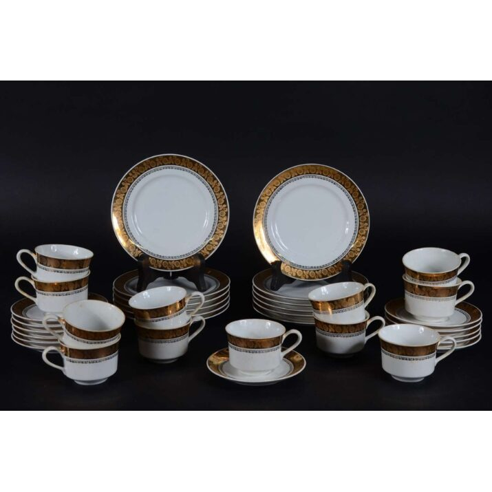 Conjunto para chá de porcelana Real branca com tarja dourada, composto de 12 xicaras com pires e 12 pratos de sobremesa. Total 24 peças.