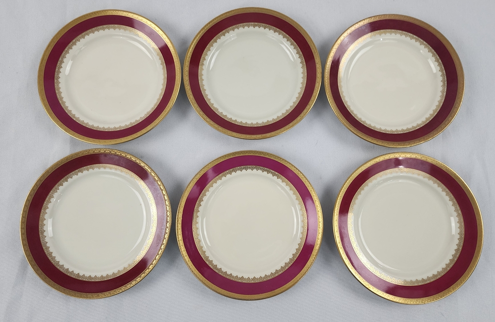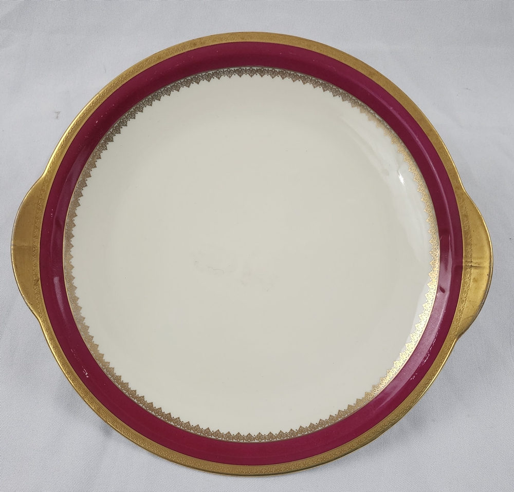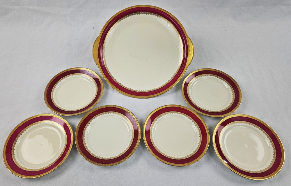 Pierken Hammer, Czechoslovakia – Conjunto para sobremesa em porcelana esmaltada na cor marfim com faixa carmim, arabescos e frisos realçados a ouro. Manufatura no verso.
